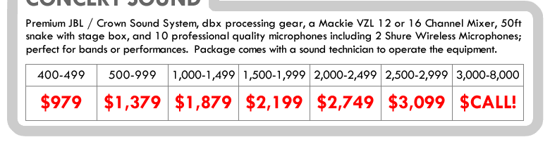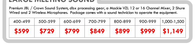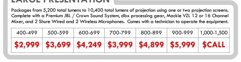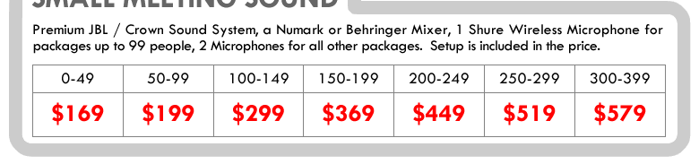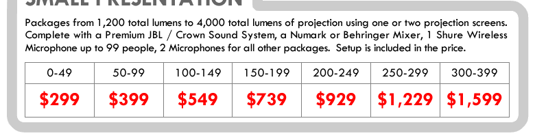 For larger conferences, you can use our quick and easy conference quote for to get a fast, free, no obligation quote for your event. For smaller conferences and corporate events, we have ready made packages available that work in most venues and make estimating your cost a breeze! All our package pricing is based on the number of guests at your event. Why? The more guests typically equates to larger rooms, and the larger the room, the more equipment we need to use. For example, our Small Meeting Package starts at just $129 and comes with 1 x JBL EON 10" powered speaker (300 watts of power) which covers up to 49 guests. In a larger room with 300-399 guests, we use a JBL MRX Sound System with a Crown amplifier rack (5,000 watts of power).